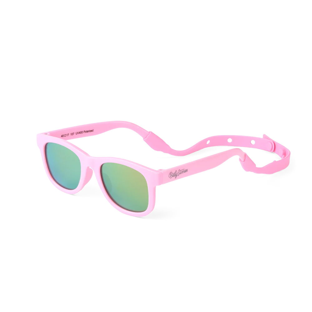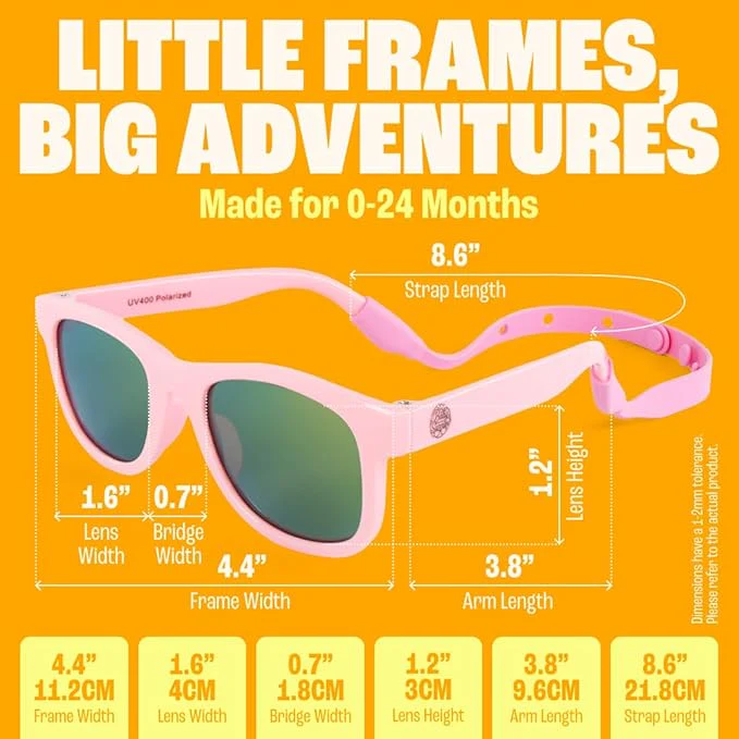Passar pojkar och flickor 0–24 månader; Bekvämt fäst rem anpassar sig till barnets huvudstorlek och håller solglasögonen säkert på plats.