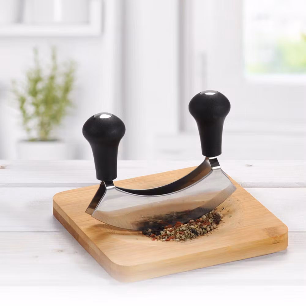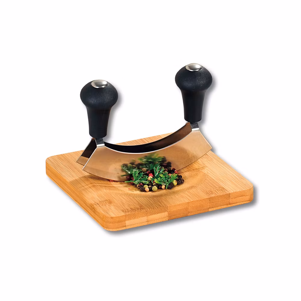 Den medföljande vaggkniven hjälper dig att hacka örterna skonsamt så att de behåller och utvecklar sin fulla arom. Efter användning rengörs brädan och kniven enkelt för hand med varmt vatten och lite diskmedel – redo för nästa användning.